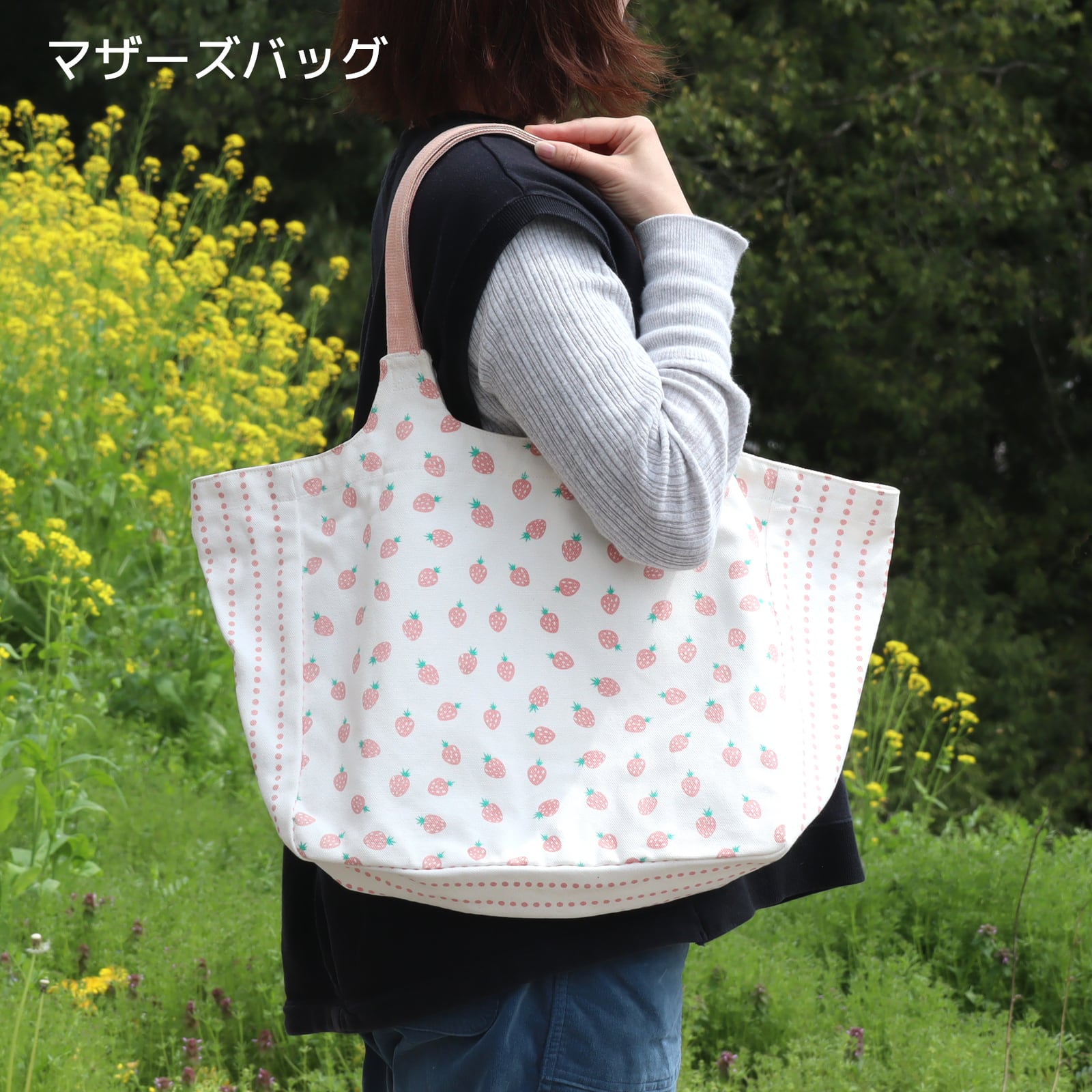 やわらかいピンクの色合いといちご柄がかわいいマザーズバッグ。